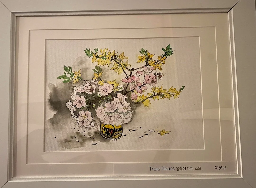 “So how’s this for a coincidence, Tim and I were walking thru a park trying to find a waterfall trail but came across an art exhibition where nice Korean ladies invited us in. The one lady was one of the artist and showed us her work. Then we looked at the other paintings, one with flowers and cherry blossoms caught Tim’s eye, thinking you’d like it and he noticed the vase said Pittsburgh Steelers so the ladies were very excited to hear we were from there and told me it’s for sale and they could contact the artist.